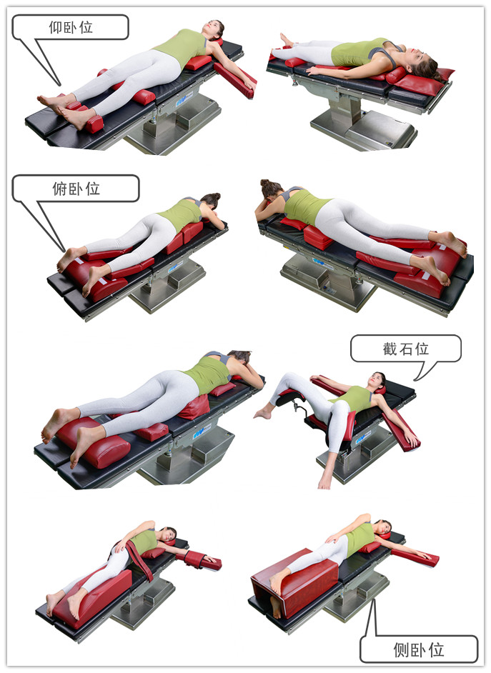1、仰臥位:圓形頭圈、上肢凹形體位墊、肩墊、半圓形墊、足跟墊;