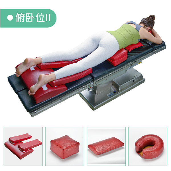 俯臥位墊的頭部位置設有墊高墊,形成透氣窗,使呼吸順暢。